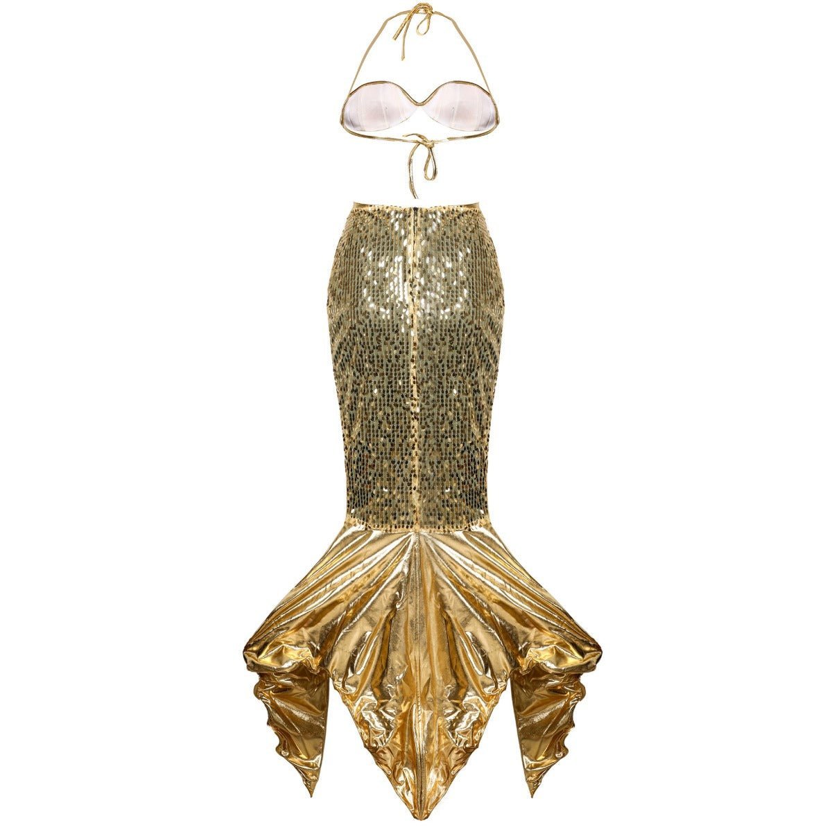 Costume de Sirène Dorée à Paillettes – Soutien-gorge Coquille et Jupe Queue de Sirène à Fente Haute